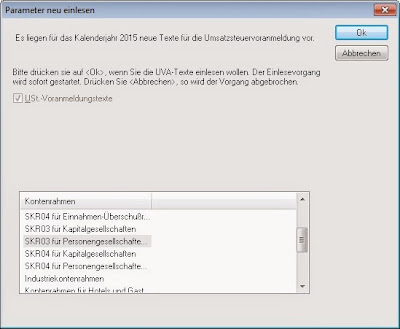 Nach der Aktualisierung des Elstermoduls kann es passieren, dass Ihr noch das benötigte UVA-Formular neu einlesen müsst. Diese wird über ein Servicepatch meist im Januar/Februar des neuen Jahres von Sage bzw. der OFD bereitgestellt. Hierfür müsst Ihr lediglich den richtigen Kontenrahmen im unterem Bereich (s. Bild – leicht gräulich hinterlegt) anklicken und auf „OK“ bestätigen. Danach wird es automatisch eingelesen. Dies könnt Ihr selbstverständlich auch vorher manuell erledigen, indem Ihr im Modul Finanzbuchhaltung über die Menüleiste „Extras/Parameter neu einlesen“ auswählt.