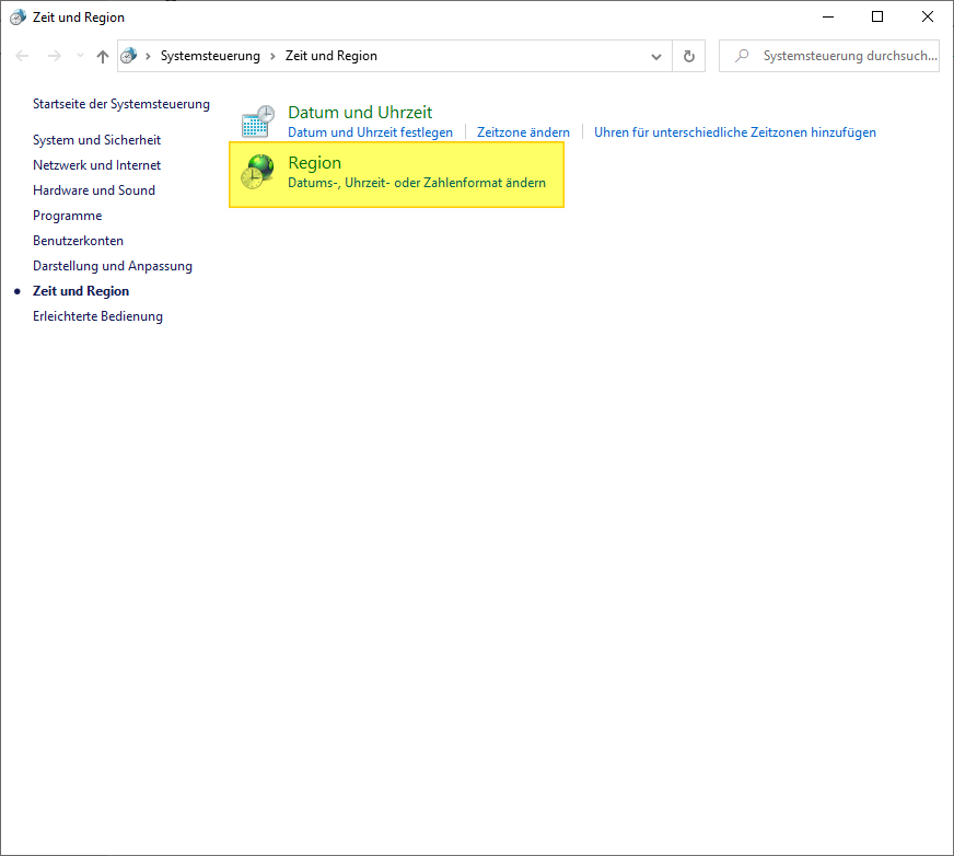Suchen und Öffnen Sie bitte unter Microsoft Windows die Systemsteuerung und klicken Sie dort bitte die Rubrik „Zeit und Region“ – Einstellungen an.